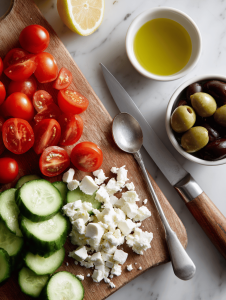 Step 2: Chop the veggies: cucumber, tomatoes, red onion. Keep pieces uniform for even dressing absorption.