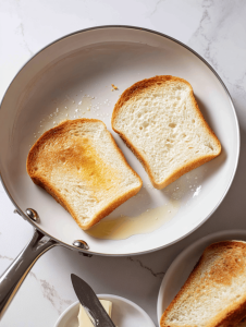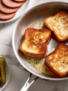 - While the bologna fries, toast your bread slices until lightly golden, either in a toaster or by adding them to the skillet for 1-2 minutes, pressing down gently for extra crunch.